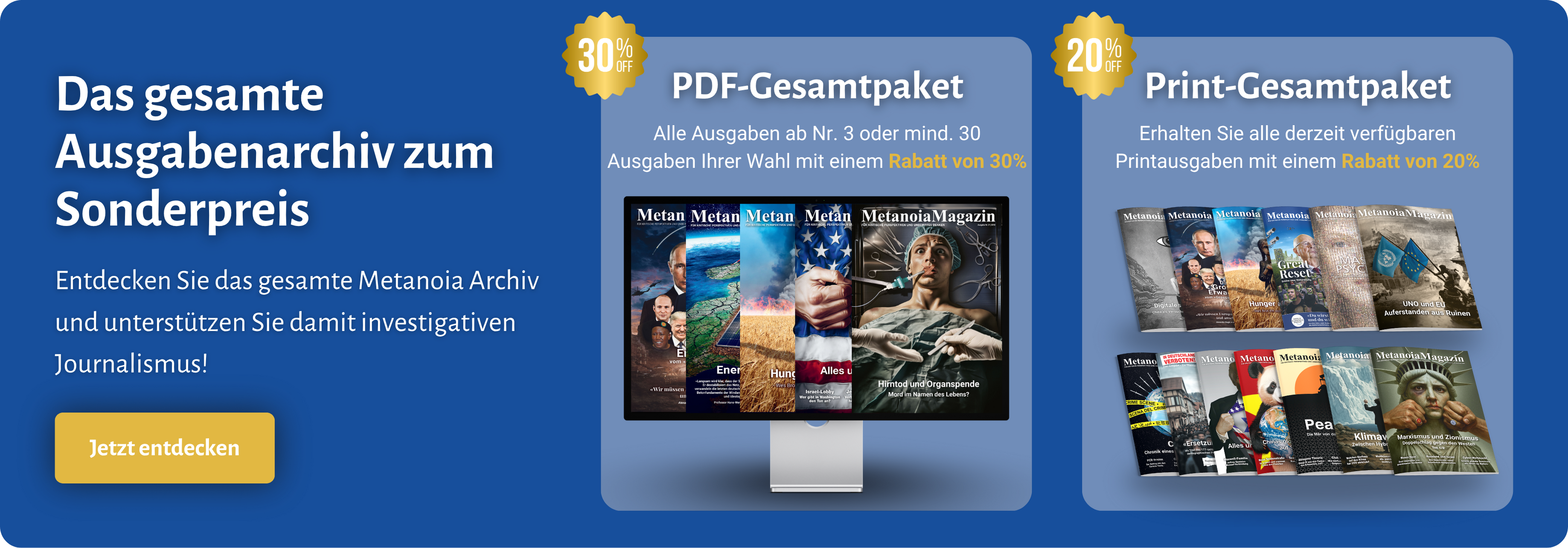 Wir möchten unser gesamtes Archiv als hochwertiges Metanoia Magazin neu auflegen. Da dies schrittweise erfolgt, entscheiden wir in Serien, welche Ausgaben als nächstes erscheinen. Nehmen Sie jetzt an unserer Kundenumfrage teil und teilen Sie uns Ihre Favoriten mit – so bestimmen Sie aktiv mit, welche Ausgaben als nächstes neu aufgelegt werden!