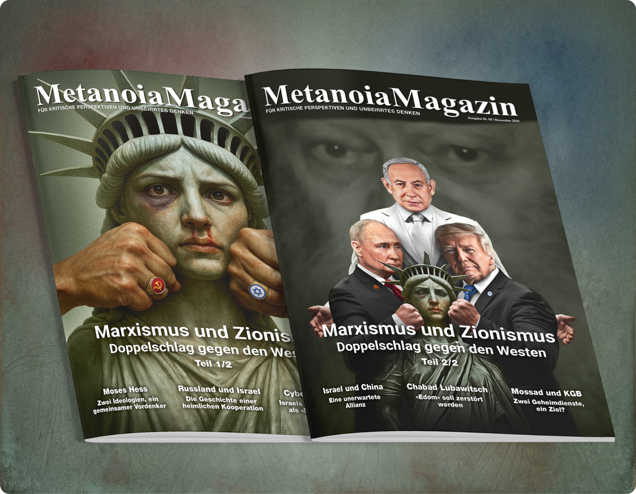 Je weiter man die Spur verfolgt, desto mehr treten ideologische und religiöse Motivationen hervor. Die Endzeitsekte Chabad Lubawitsch, die selbst einen bedeutenden Teil der Israel-Lobby einnimmt, macht kaum einen Hehl daraus. Gleichzeitig bildet sie ein Bindeglied der israelischen und russischen Interessen. Einer der wichtigsten gemeinsamen Nenner ist der Westen als Feind, den es zu zerstören gilt. Die Parallelen zwischen Zionismus und Kommunismus kommen nicht von ungefähr. In der dritten Doppelausgabe Marxismus und Zionismus - Doppelschlag gegen den Westen (Nr. 68/69)befassen wir uns vor allem damit, wie die zwei vermeintlich sich feindlich gegenüberstehende Machtbewegungen im Kern gemeinsam gegen den Westen alias Edom bzw. Amalek vorgehen.