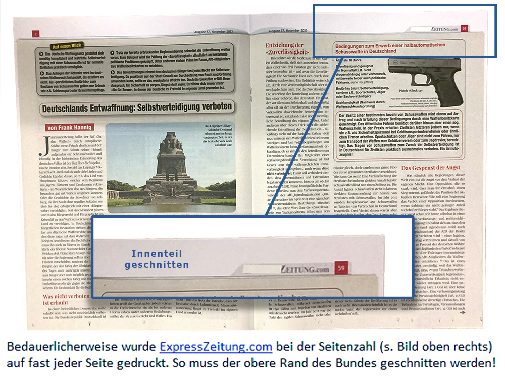 Der Kölner Express hat mit der Behauptung, wir würden seinen Markenschutz verletzen, eine Einstweilige Verfügung erwirken können, womit uns per 14.12.2023 untersagt wurde, den bisherigen Namen ExpressZeitung in Deutschland zu verwenden. Seither konnten alle Einzelausgaben (bis und mit Nr. 57) nur noch an Lieferadressen AUSSERHALB von Deutschland bestellt werden.